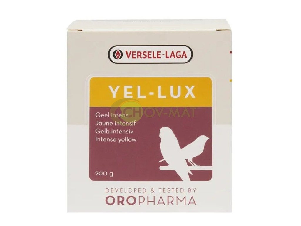 OropharmaYel-Lux je prírodné žlté farbivo na báze luteínu. Doplnkové krmivo zintenzívni žlté sfarbenie peria a zvyšuje odolnosť sfarbenia. Keďže perie pozostáva z mŕtvych buniek, ktoré už nie sú ovplyvňované metabolizmom, farbivo sa absorbuje pri tvorbe peria. V priemere sa operenie mení raz ročne, avšak nie naraz. Vypadávanie starého peria je stimulované rastom nového, je to postupný proces, aby si zviera udržalo plné operenie. Pridaním Yel-Luxu do krmiva sa farbivo presunie do miesta rastu peria a perie získa intenzívnejšie žlté sfarbenie. Narastené perie si udrží svoje žlté sfarbenie, až kým sa nevytvorí nové perie.