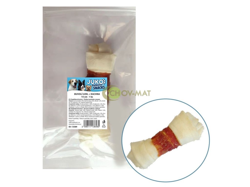 Skvelá pochúťka v tvare uzla, ktorá uspokojuje prirodzenú túžbu a potrebu žuť. Uzly sú z tvrdej byvolej kože, čo pri žuvaní napomáha udržiavať zuby silné a zdravé . Delikatesnú chuť zaistí sušené kačacie mäso.